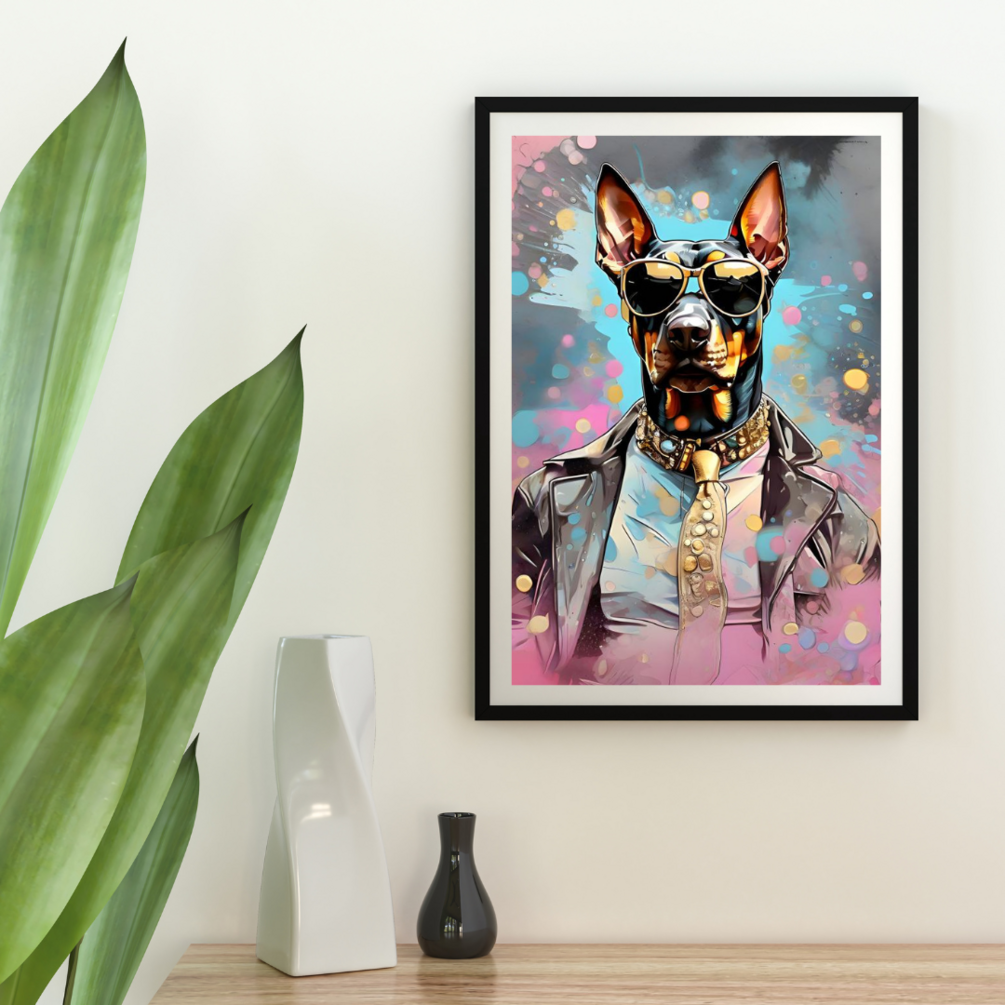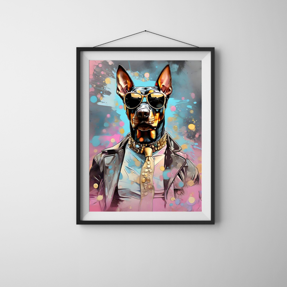 "In the heart of the city, a debonair Dobermann named Max commands attention with his impeccable style. Clad in a sleek leather jacket that gleams under the city lights, and sporting trendy sunglasses that reflect the urban landscape, he embodies an air of sophistication and cool. With each confident step, he turns heads and captures hearts, a true icon of urban elegance."